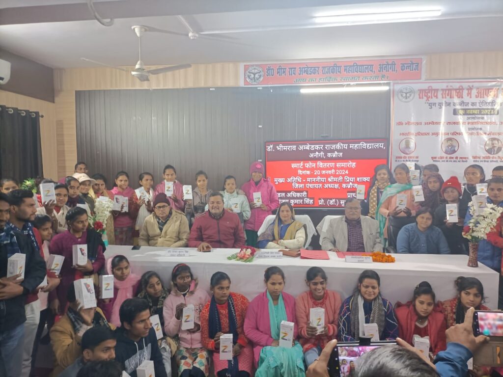 जलालाबाद, कन्नौज। शनिवार को अनौगी स्थित डॉ भीमराव अंबेडकर राजकीय महाविद्यालय में उत्तर प्रदेश सरकार की स्वामी विवेकानंद युवा सशक्तिकरण योजना के अंतर्गत स्मार्टफोन वितरण कार्यक्रम आयोजित किया गया। कार्यक्रम का शुभारंभ मुख्य अतिथि जिला पंचायत अध्यक्ष प्रिया शाक्य व प्राचार्य डॉ सुशील कुमार शाक्य ने मां सरस्वती के चित्र पर दीप प्रज्वलित व माल्यार्पण कर किया। इसके अतिथि ने छात्र-छात्राओं स्मार्टफोन का वितरण किया। इस दौरान जिला पंचायत अध्यक्ष प्रिया शाक्य ने कहा कि सरकार की स्मार्टफोन वितरण योजना छात्र छात्राओं के हित के लिए बेहतर साबित हो रही है। कहा कि छात्र- छात्राएं इस स्मार्टफोन का प्रयोग अपने शैक्षिक गतिविधियों को बढ़ाने में करना चाहिए। उन्होंने छात्र-छात्राओं विशेष तौर पर लड़कियों से कहा कि ग्रामीण क्षेत्र में स्थित यह राजकीय महाविद्यालय आप सबके लिए एक वरदान के समान है। छात्र-छात्राएं इस शिक्षा संस्थान में अध्ययन करके जीवन में ऊंचाइयों को छू सकते हैं। कार्यक्रम के अंत में प्राचार्य प्रोफेसर डॉ सुशील कुमार शाक्य ने आए हुए अतिथियों को धन्यवाद व्यापित करते हुए कहा कि उनके आगमन से महाविद्यालय के छात्र-छात्राओं को प्रेरणा और ऊर्जा प्राप्त हुई है। इस मौके पर डॉ संजय सिंह, डॉ हेमंत सिंह, डॉ. शिप्रा वर्मा, डॉ. सत्यवीर सिंह, डिंपल कुशवाहा ,डॉ. अखिलेश, डॉ. विजय बहादुर, डॉरफी सक्सेना सहित आदि रहे।