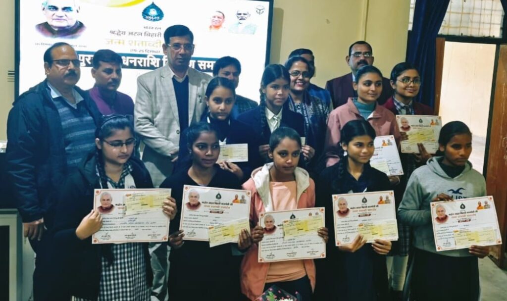 कन्नौज। जनपद स्तरीय प्रतियोगिताओं का पुरस्कार एवं प्रोत्साहन धनराशि वितरण समारोह का आयोजन किया गया। राजकीय महिला महाविद्यालय बांगर के तत्वावधान में पूर्व प्रधानमंत्री भारत रत्न अटल बिहारी वाजपेई के जन्म शताब्दी के अवसर पर महाविद्यालय की प्राचार्य रीतू सिंह के निर्देशन में विभिन्न प्रकार के कार्यक्रमों का आयोजन किया गया। कार्यक्रम की शुरुआत पूर्व प्रधानमंत्री भारत रत्न अटल बिहारी वाजपेयी की जयंती पर उनके चित्र पर माल्यार्पण और श्रृद्धा सुमन अर्पित की गईं। आयोजित साप्ताहिक कार्यक्रमों का समापन भी हुआ। प्रतियोगिताओं के विजेताओं को पुरस्कार धनराशि का वितरण भी किया गया। भाषण प्रतियोगिता में राजकीय महिला महाविद्यालय बांगर की द्वितीय वर्ष की नंदनी दुबे प्रथम स्थान और चौधरी चन्दन सिंह महाविद्यालय की काजल सिंह द्वितीय स्थान और प्रियांशी दीक्षित तृतीय स्थान पर रहीं। एकल काव्य पाठ प्रतियोगिता में भारतीय शिक्षा सदन इंटर कॉलेज सिकंदरपुर की करिश्मा प्रथम, आर एस पब्लिक स्कूल तिर्वा की अंकिता वर्मा द्वितीय एवं विमला देवी बृजमोहन सिंह इंटर कॉलेज की काजल ने तृतीय पुरस्कार प्राप्त किया। प्रतिभागियों को क्रमशः 10000, 5000 एवं 2500 की धनराशि प्रदान की गई।निबंध प्रतियोगिता में मालती देवी मेमोरियल पब्लिक स्कूल तिर्वा की अमृतदीप कौर प्रथम, अशोक कुमार दुबे इंटर कॉलेज की अंशिका शर्मा द्वितीय और आर एस पब्लिक स्कूल तिर्वा की वैष्णवी ने तृतीय पुरस्कार प्राप्त किया। जिनको प्रोत्साहन धनराशि 5000, 3000 एवं 2000 क्रमशः दी गई। पुरस्कार धनराशि का चेक मुख्य अतिथि जिला विद्यालय निरीक्षक डॉपूरन सिंह एवं जनप्रतिनिधि भाजपा सदस्य राम नरेश वर्मा ने प्रदान वितरित की। प्रतियोगिताओं के प्रमाणपत्र बीते दिन कलेक्ट्रेट के गांधी सभागार में जिला अधिकारी शुभ्रांत कुमार शुक्ल द्वारा छात्र- छात्राओं को वितरित किया गया था। प्राचार्य रीतू सिंह सिंह ने विजेता छात्र- छात्राओं को बधाई दी। और बाजपेयी के जीवन पर प्रकाश डाला। इस दौरान प्रदेश सरकार द्वारा आयोजित कार्यक्रम का सीधा प्रसारण भी दिखाया गया।