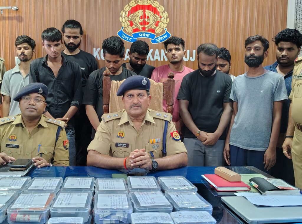 कन्नौज। ऑनलाइन गेमिंग के जरिये आम जनता से करोड़ों रुपये की साइबर ठगी करने वाले एक अंतरजनपदीय गिरोह का खुलासा किया है। पुलिस ने इस गिरोह के 10 शातिर सदस्यों को गिरफ्तार कर उनके कब्जे से 13 मोबाइल फोन, 18 क्रेडिट व डेबिट कार्ड, 2 कारें, और ₹1,76,000 नगद समेत ठगी में प्रयुक्त अन्य सामग्री बरामद की। सदर थाना कोतवाली के थाना प्रभारी जितेन्द्र प्रताप सिंह, प्रभारी निरीक्षक जितेन्द्र प्रताप सिंह, उप निरीक्षक आलोक कुमार सिंह, उप निरीक्षक राजेश प्रताप सिंह सहित पुलिस टीम ने गिरोह को जीटी रोड तिखवा कट से पकड़ा गया जब वह दो कारों में सवार होकर कहीं जाने की फिराक में थे। जिसमें मोहित चोपड़ा (28) पुत्र सुरेन्द्र चोपड़ा निवासी H-140 विकासपुरी थाना विकासपुरी न्यू दिल्ली, अजीत कुमार (32) पुत्र रामबहाल निवासी बघुआ थाना बखिरा सन्त कबीर नगर, सतीश कुमार मौर्य (26) पुत्र जमुना प्रसाद मौर्य निवासी रामपुर गोसार्क थाना जगदीश अमेठी, आशुतोष कुमार (31) पुत्र बोधराम निवासी श्याम विहार कालोनी फजुल्लागंज थाना मडियाव लखनऊ, अमित गुप्ता (26) पुत्र स्व0 मनोज कुमार गुप्ता निवासी कस्वा व थाना फूलपुर आजमगढ़, संदीप गुप्ता (31) पुत्र राम ब्रज गुप्ता निवासी E-48/5 महावीर विहार कंजावला थाना कंजावला नई दिल्ली, यश श्रीवास्तव (24) पुत्र प्रेम कुमार निवासी F-1284 राजाजी पुरम थाना तालकटोरा लखनऊ, आयुष पाल (18) पुत्र साजन लाल निवासी मकान नं0 526 फत्तेपुर अलीगंज थाना अलीगंज लखनऊ, मो0 साहिल (18) पुत्र युसुफ खां निवासी रामलीला मैदान नौबस्ता पुलिया मडियाव थाना मडियाव लखनऊ, अंकित सिंह (22) पुत्र स्व0 कमलेश बहादुर सिंह निवासी डोमीपुर थाना जिठवारा जनपद प्रतापगढ को गिरफ्तार किया गया। गिरफ्तार अभियुक्तों के विरुद्ध थाना कोतवाली में मुकदमा दर्ज किया गया। आरोपियों को न्यायालय में प्रस्तुत कर अग्रिम कार्रवाई की गयी। कुछ अभियुक्तों का पूर्व में भी आपराधिक इतिहास रहा है। आशुतोष कुमार व अंकित सिंह पर पूर्व में कई संगीन धाराओं में मुकदमे दर्ज हैं।