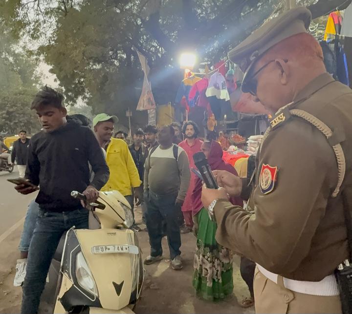 कन्नौज। यातायात व्यवस्था को दुरुस्त करने के लिए चलाए जा रहे अभियान के तहत शुक्रवार को रोडवेज बस स्टैंड के पास नशे में वाहन चलाने वालों पर पुलिस ने कड़ी कार्रवाई की। क्षेत्राधिकारी यातायात डॉ. प्रियंका वाजपेई के नेतृत्व में प्रभारी यातायात रविशंकर त्रिपाठी के साथ टीएसआई आफाक ख़ां ने वाहन चेकिंग अभियान चलाया। इसी दौरान एक स्कूटी पर तीन नवयुवकों को आते देखा। संदिग्ध प्रतीत होने पर उन्हें रोककर ब्रेथ एनालाइज़र से जांच की गई। जांच में स्कूटी चालक नशे की हालत में पाया गया। नियमों का उल्लंघन करने पर टीएसआई आफाक ख़ां ने स्कूटी को सीज करते हुए उसे तत्काल सदर कोतवाली में निरुद्ध कर दिया। कार्रवाई के वक्त प्रभारी यातायात सहित कई पुलिसकर्मी मौजूद रहे। पुलिस ने बताया कि सड़क सुरक्षा को ध्यान में रखते हुए ऐसे वाहनों एवं चालकों पर कठोर कार्रवाई जारी रहेगी।