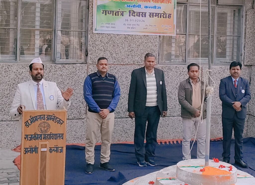 जलालाबाद, कन्नौज। क्षेत्र के अंनौगी स्थित डॉ. भीमराव राजकीय महाविद्यालय में 77वां गणतंत्र दिवस समारोह को हर्षोल्लास और गरिमामय वातावरण में मनाया गया। कार्यक्रम का शुभारंभ प्राचार्य डॉ. हेमेंद्र सिंह द्वारा राष्ट्रीय ध्वज फहराने के साथ हुआ। इसके पश्चात सामूहिक राष्ट्रगान से पूरा परिसर देशभक्ति के रंग में रंग गया। चीफ प्रॉक्टर डॉ. संजय कुमार सिंह ने उच्च शिक्षा निदेशक का संदेश पढ़कर उपस्थित जनसमूह को सुनाया। इसके बाद सांस्कृतिक कार्यक्रमों का आयोजन किया गया, जिसका संचालन विज्ञान संकाय प्रभारी डॉ. हरीराम यादव ने किया। सांस्कृतिक कार्यक्रमों में छात्र-छात्राओं ने उत्साहपूर्वक भाग लिया और देशभक्ति गीत, ग़ज़ल, कविता एवं शायरी प्रस्तुत कर खूब तालियां बटोरीं। प्राचार्य डॉ. हेमेंद्र सिंह ने अपने संबोधन में कहा कि भारतीय संविधान केवल कानूनों का संग्रह नहीं है, बल्कि यह समानता, स्वतंत्रता, बंधुत्व और न्याय जैसे मूल्यों पर आधारित एक जीवंत दस्तावेज़ है। यह हमें सिखाता है कि हर नागरिक समान अधिकार और सम्मान का अधिकारी है, यही हमारे लोकतंत्र की सबसे बड़ी ताकत है। इस मौके पर वरिष्ठ सहायक मंगल सिंह, मानेंद्र, रवि, गौरव, संबेस, साइट इंजीनियर विशाल सहित बड़ी संख्या में छात्र-छात्राएं एवं कर्मचारी रहे