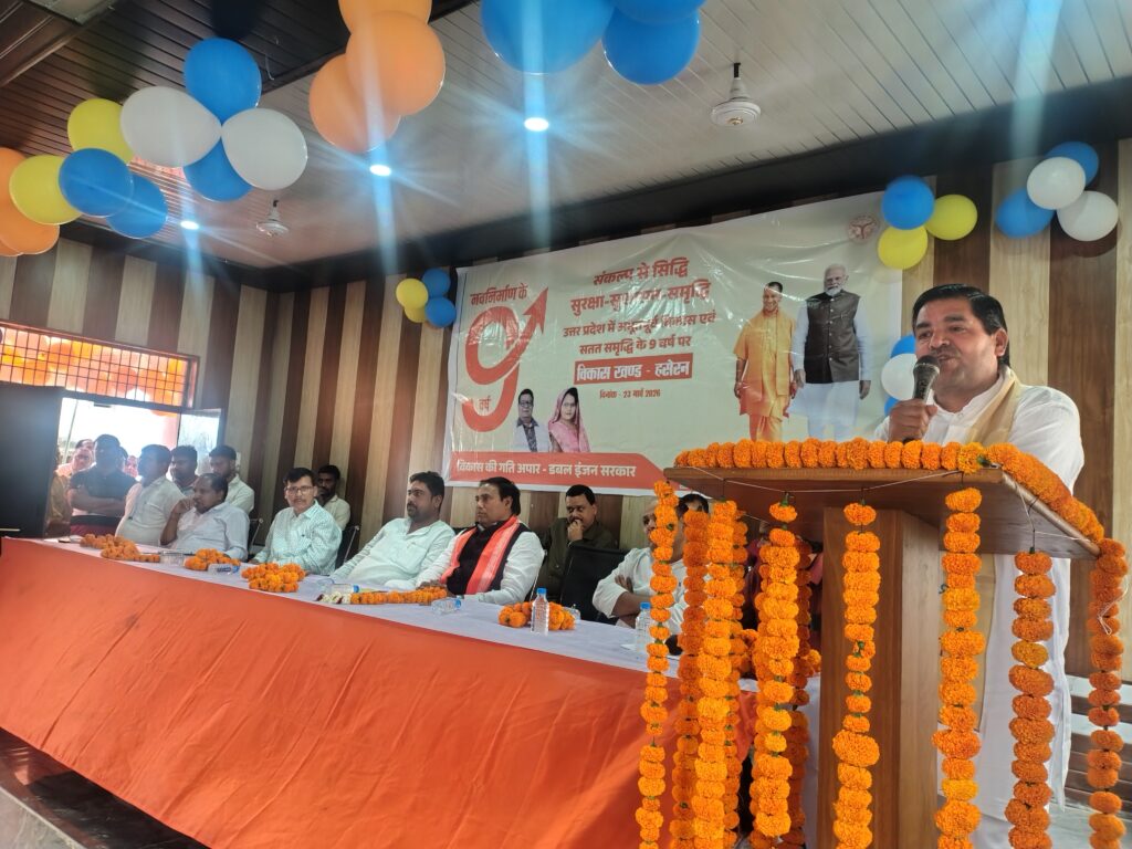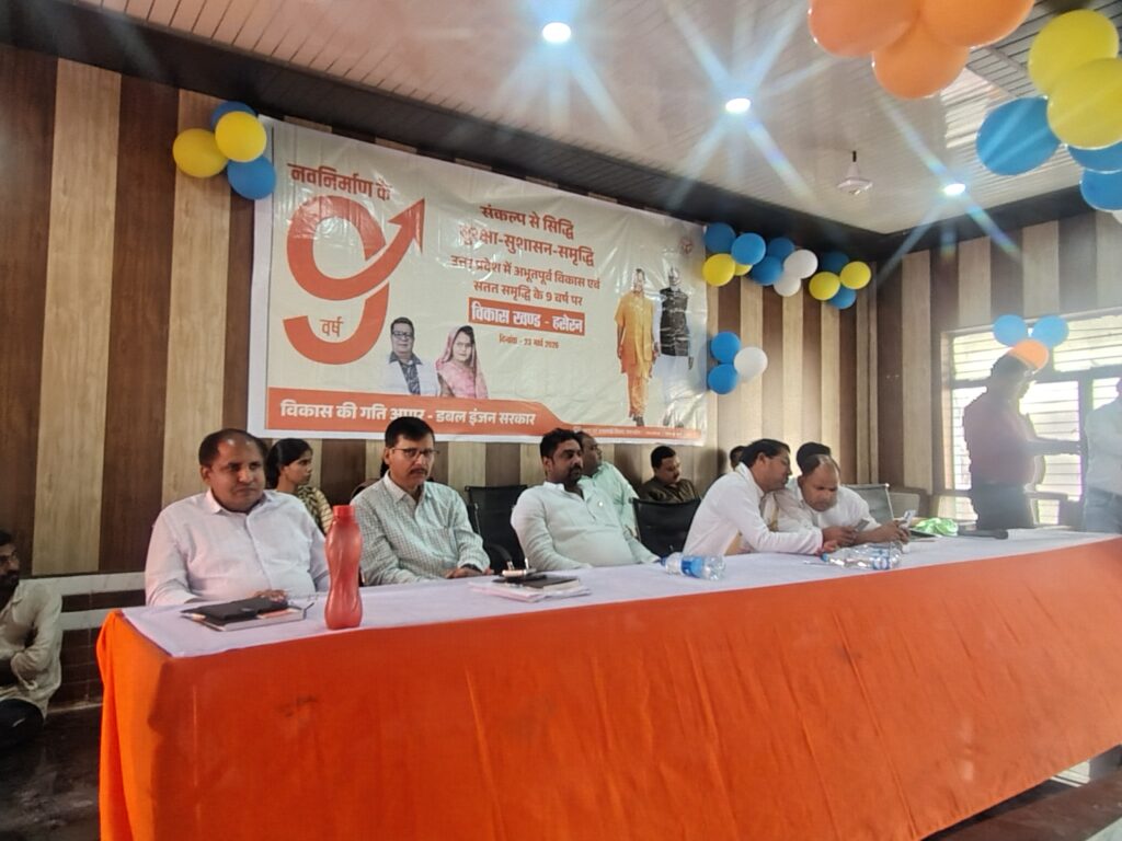 हसेरन। भारतीय जनता पार्टी सरकार के नौ वर्ष के कार्यकाल को पूर्ण होने पर ब्लॉक परिसर में कार्यक्रम आयोजित हुआ। जिसमें भाजपा के पूर्व जिला अध्यक्ष समेत क्षेत्रीय नेता ब्लॉक के आला अधिकारी मौजूद रहे। ब्लॉक सभागार में शासन के नौ वर्ष पूर्ण होने पर कार्यक्रम किया गया। स्वयं सहायता समूह आंगनबाड़ी कार्यकत्री सहित एकदिवसीय स्वास्थ्य मेला का आयोजन हुआ। कार्यक्रम में उपस्थित सभी ने अपने-अपने विचार व्यक्त किए। नवरात्र के पावन अवसर पर शिक्षक चक्रधर सिंह भदौरिया ने देवी गीत गाकर भाव विभोर किया। बैठक में उपस्थित प्रधानाध्यापक विनय कुमार ने कहा 6 से 14 वर्ष के बच्चों को स्कूल से जोड़ने का काम करेंगे। 1 अप्रैल से नए सत्र की शुरुआत हो रही है। हम सभी अध्यापक घर-घर जाकर बच्चों को शिक्षा के प्रति जागरूक करने का काम करेंगे। स्वयं सहायता समूह से खुशबू पटेल ने बताया सरकार की योजना जन-जन तक पहुंचे। प्रदेश की डबल इंजन की सरकार ने समूह से कई महिलाओं को जोड़ने का काम किया। बेरोजगारी से रोजगार मिला। कार्यक्रम के दौरान कन्नौज पूर्व जिला अध्यक्ष नरेंद्र राजपूत ने बताया योगी आदित्यनाथ की सरकार ने जनकल्याणकारी योजनाओं का लाभ जन जन तक पहुंचाने का काम किया। देश के प्रधानमंत्री और उत्तर प्रदेश मुख्यमंत्री ने सामूहिक विवाह योजना कन्या धन योजना जैसी अनेक सुविधाओं का लाभ जन जन तक पहुंचाने का काम किया। बीजेपी हम सब की पार्टी है। सबका साथ सबका विकास का नारा देकर सभी को एक दिशा में ले जाने का काम कर रही है। कार्यक्रम में उपस्थित खंड विकास अधिकारी राम सिंह यादव , वीडियो पंचायत अतुल कुमार मिश्रा ,ब्लॉक प्रमुख प्रतिनिधि पुष्पेंद्र शाक्य, भाजपा जिला महामंत्री शैलेंद्र द्विवेदी, एनआरएलएम वीरेंद्र सिंह, आईटी सेल संयोजक हिमांशु सक्सेना , महिला मोर्चा से सुमन शाक्य सहित सैकड़ो की संख्या में लोग मौजूद रहे।